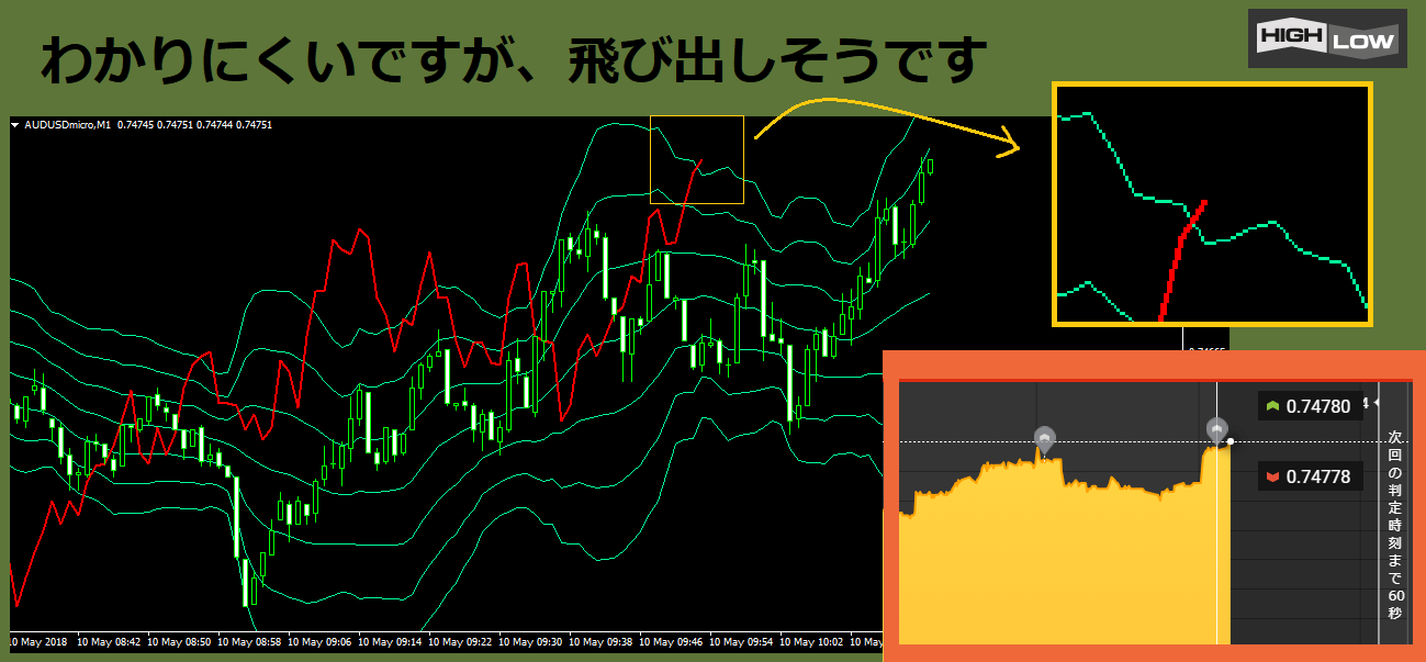 デモですから、「遅行スパン」がボリンジャーバンドから出た瞬間と、ローソク足1本ぶん待ってからと、