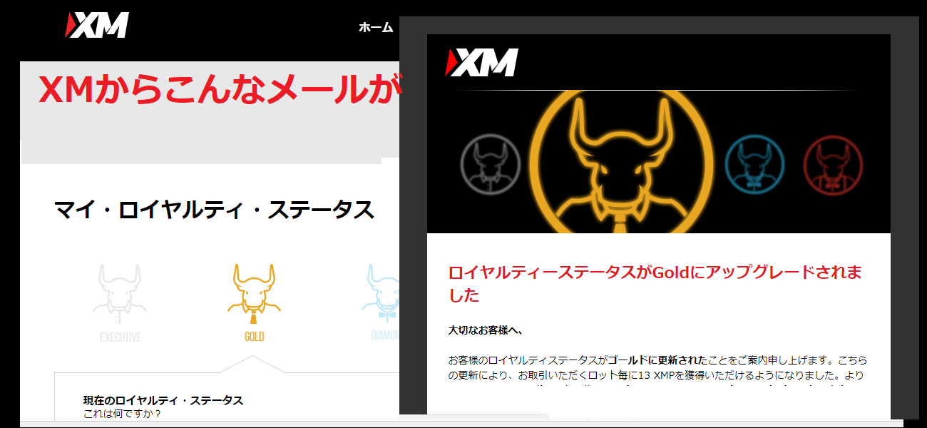 今回は、「ロイヤルティステータスがGoldになりました!」というメールがXMから来たので、