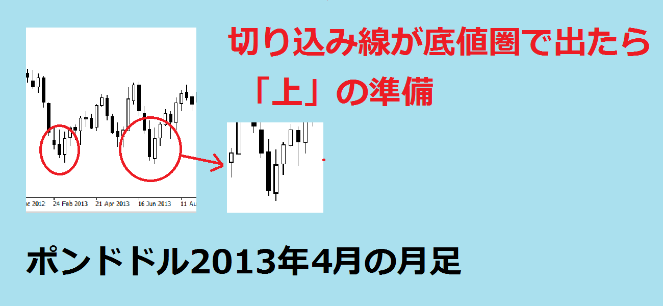 切り込み線とはローソク足チャートで、前日が大陰線で当日が陽線の組み合わせのうち、