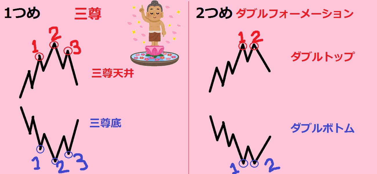 三尊は トップピークが3つで「トリプルトップ」・「ヘッドアンドショルダーズトップ」とも呼ばれます。