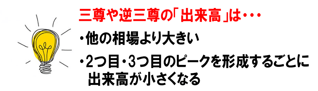 そして三尊・逆三尊はトレンド転換のシグナルになりますが、出来高とダマシには注意が必要です。