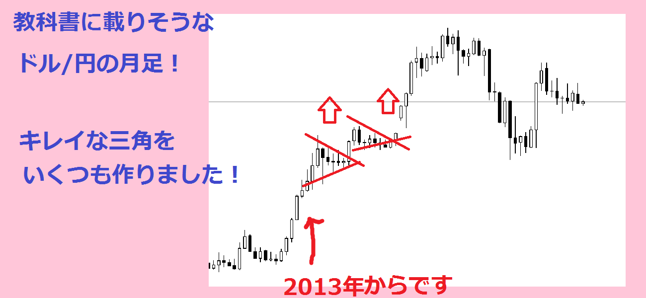よく「三角持ち合い」(さんかくもちあい)とか「三尊」(さんぞん)とか、