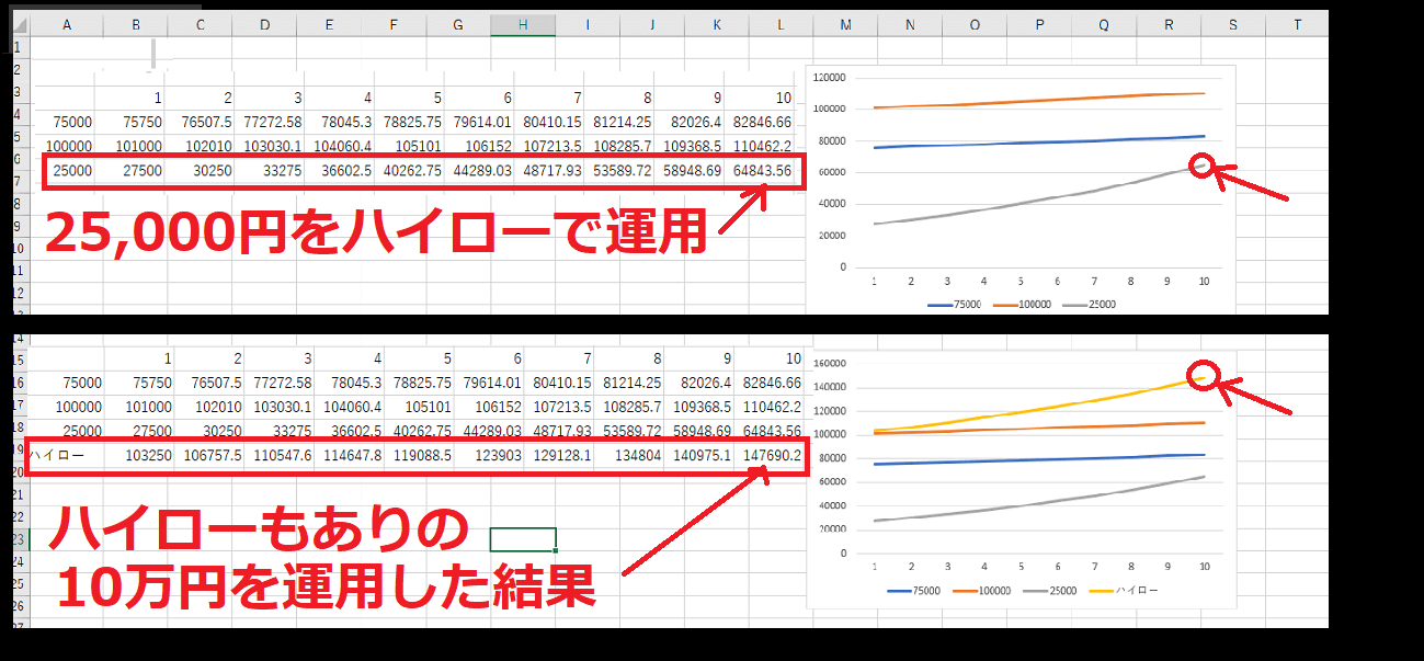 ハイローオーストラリアの口座にいくらいれると10年後にどうなるかの例をみます。