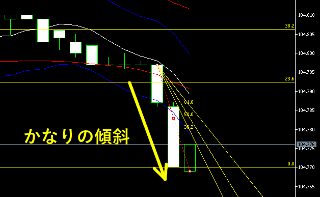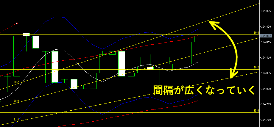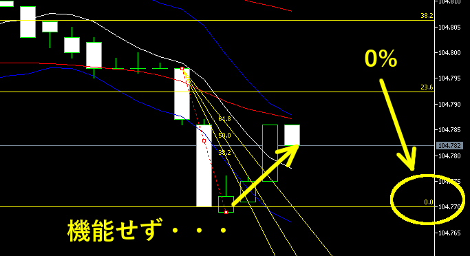 緩やかなトレンドのときに起きやすいのですが、フィボナッチ・ファンの61.8%を突破せず、