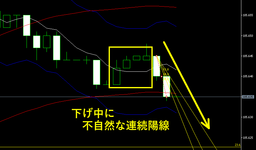 通常は、下げトレンドなら陽線が混じるため、陽線を見て入れば確実ですが、