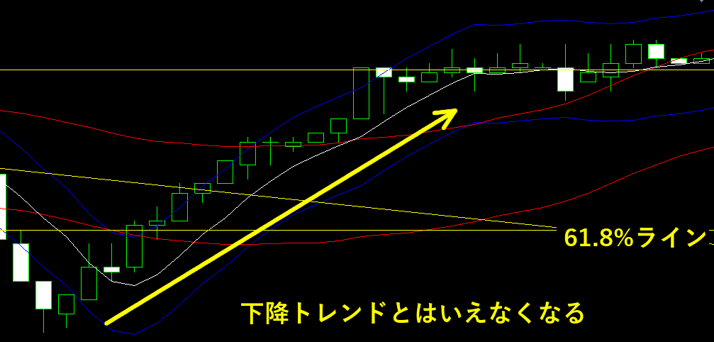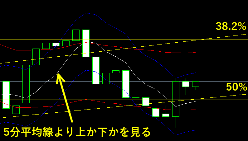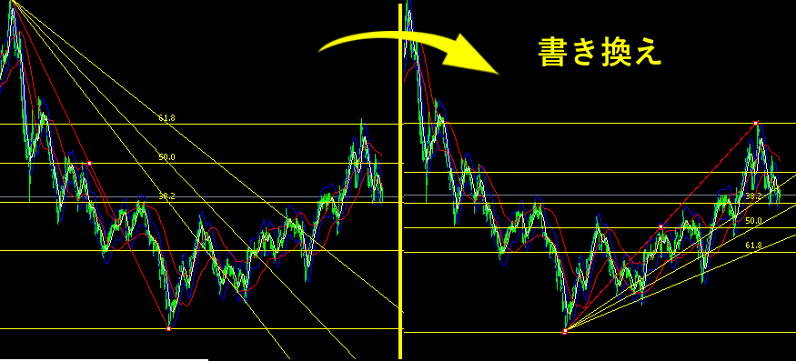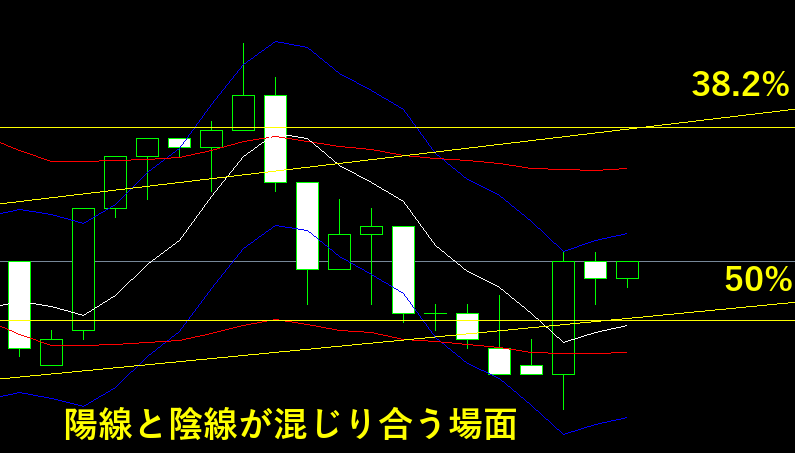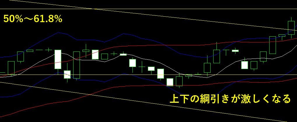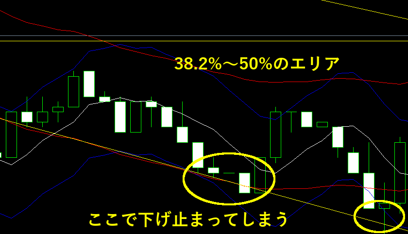 フィボナッチファンに挟まれた38.2%~50%、50%~61.8%、そして