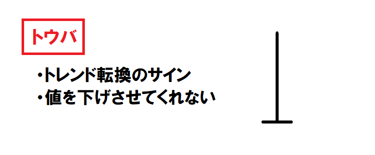 「トウバ」はヒゲが高値に大きく伸び、陰線/陽線がほとんど現れない状態です。
