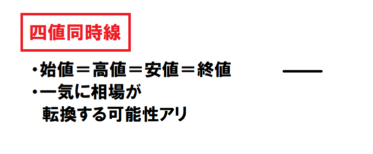 「四値同時線」は、始値・高値・安値・終値が同じ値を示し、
