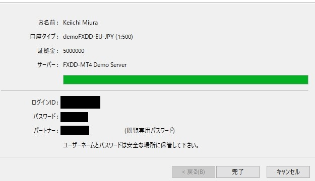 取得したログインIDとパスでログインすれば、MT4の利用を開始できます。