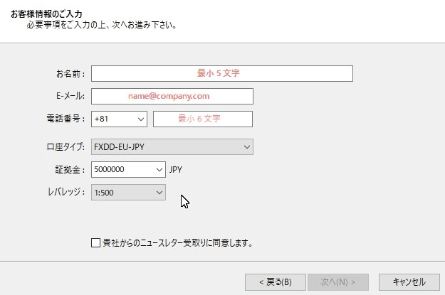 デモ口座申請画面になります。