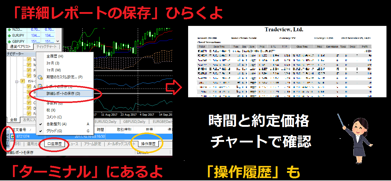 ・MT4の「詳細レポート」を出して、チャートと時間と約定価格を照らし合わせてみる。
