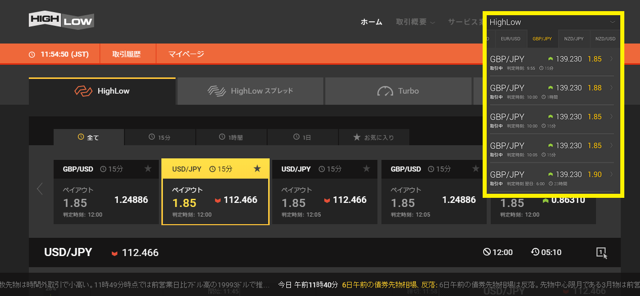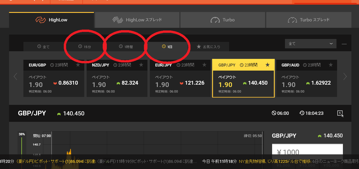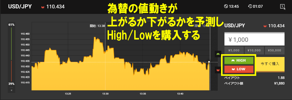 仮にHighで購入した時間(取引時間)の時の価格が判定時刻に上がっていれば勝ちとなり、