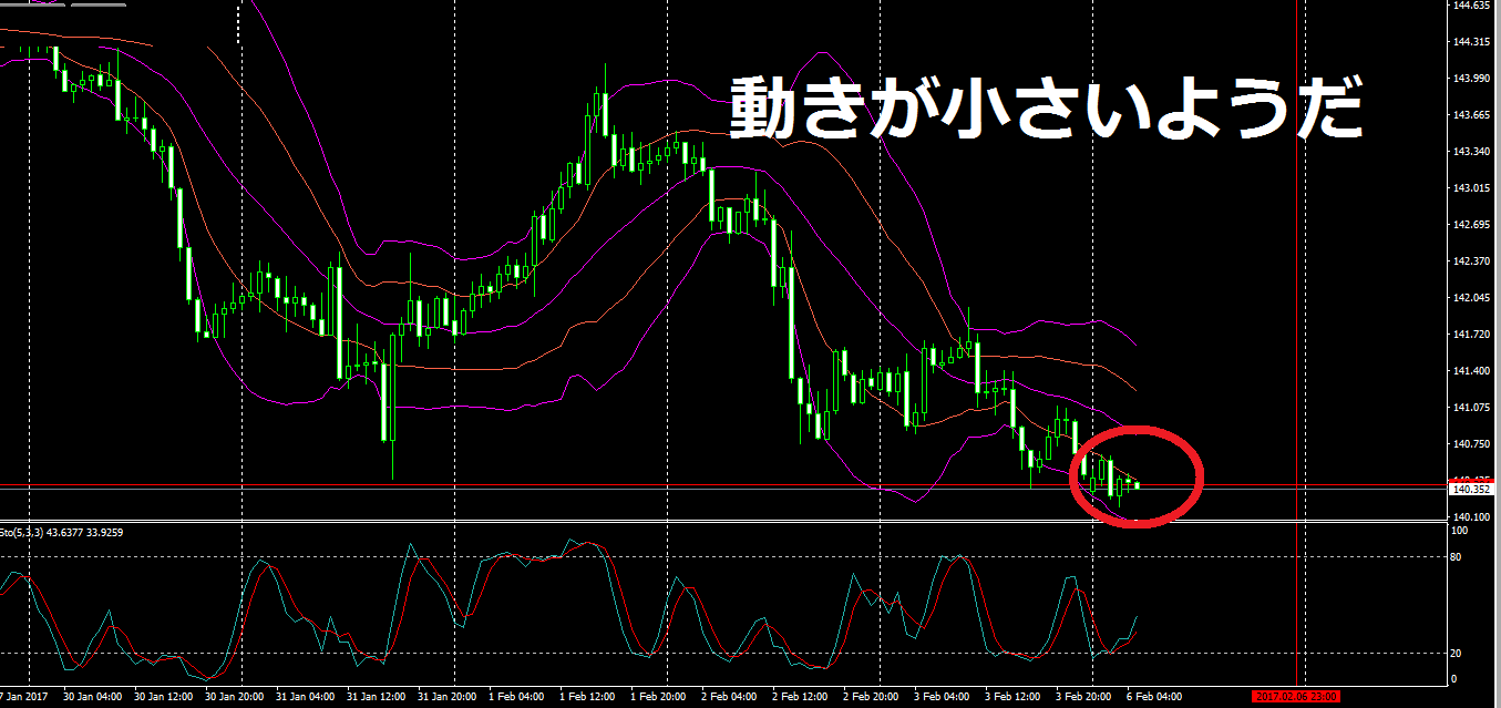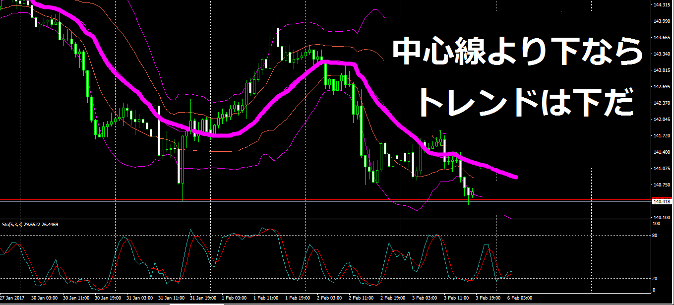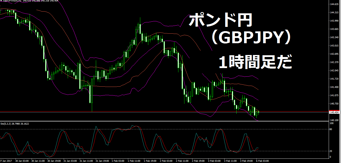 MT4には、ボリンジャーバンドと「ストキャスティクス」を表示している。