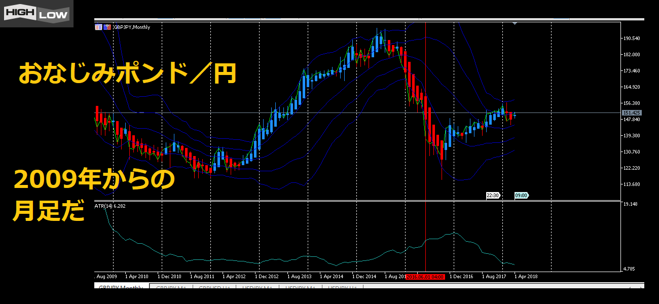 この線の前後で、ATRが上がって値動きが大きいことがわかる。