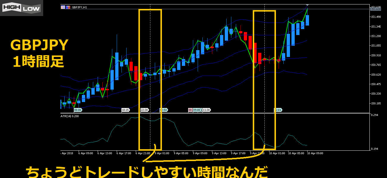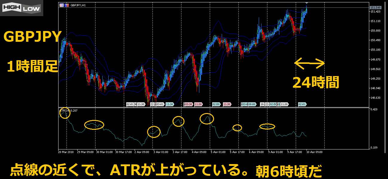 ATRが上に行くときは、その通貨ペアの値動きが大きい時間帯ということなんだ。