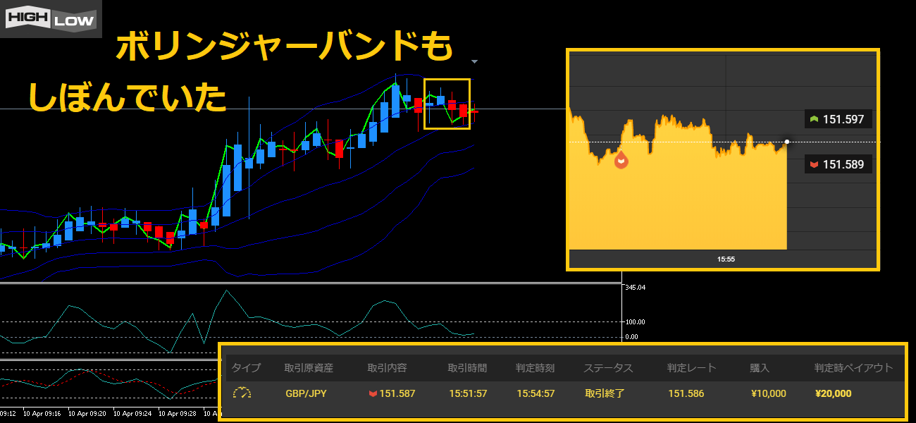 ボリンジャーバンドが縮みはじめていたのも良かったみたいだ。