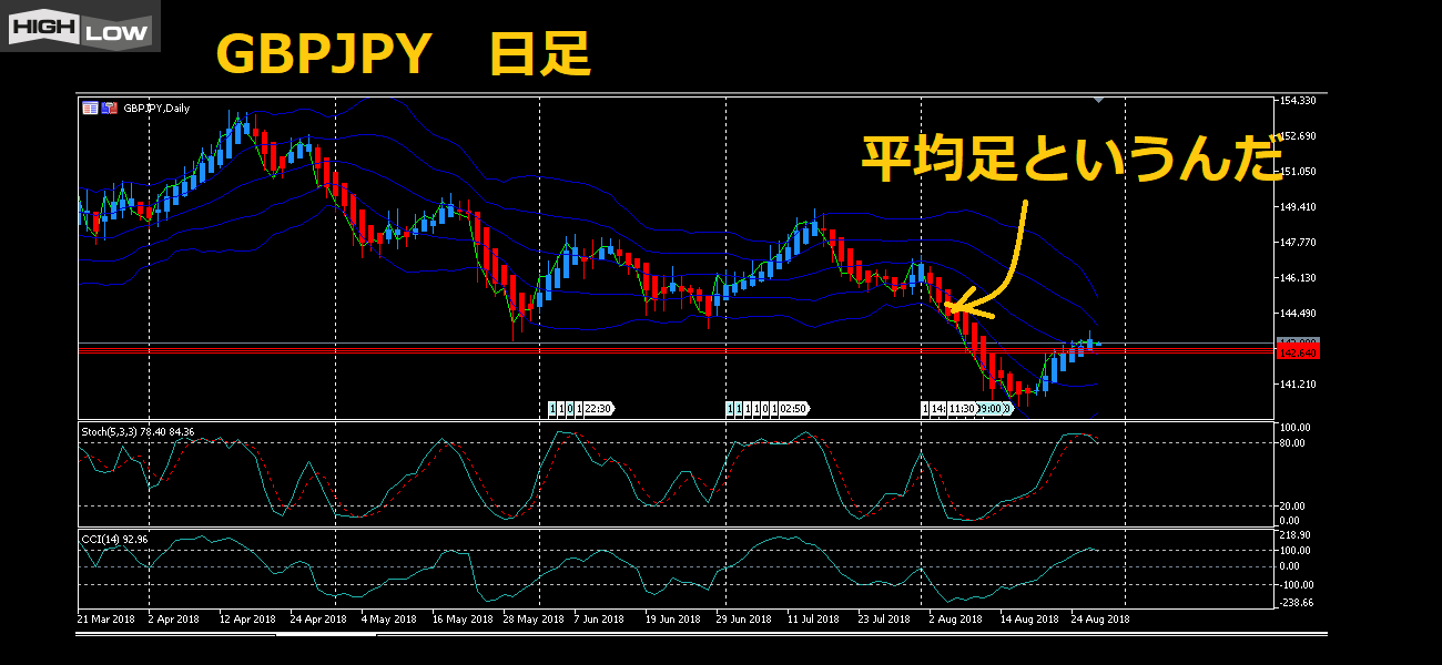平均足が上昇していたのに、だんだんと上がらなくなり、下がりそうに見える。