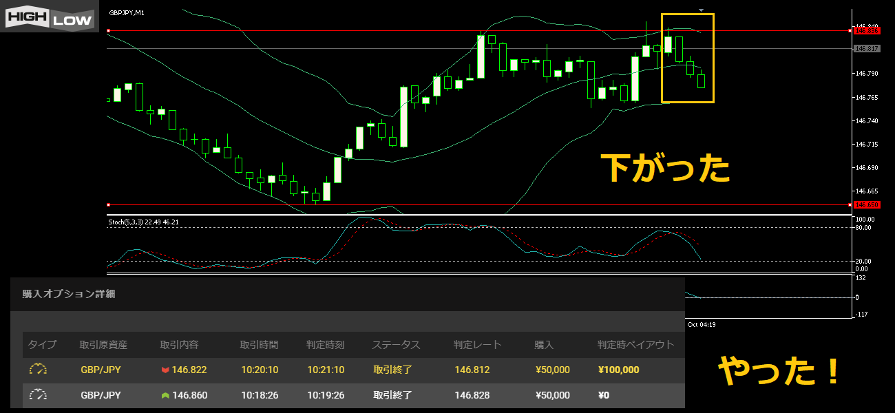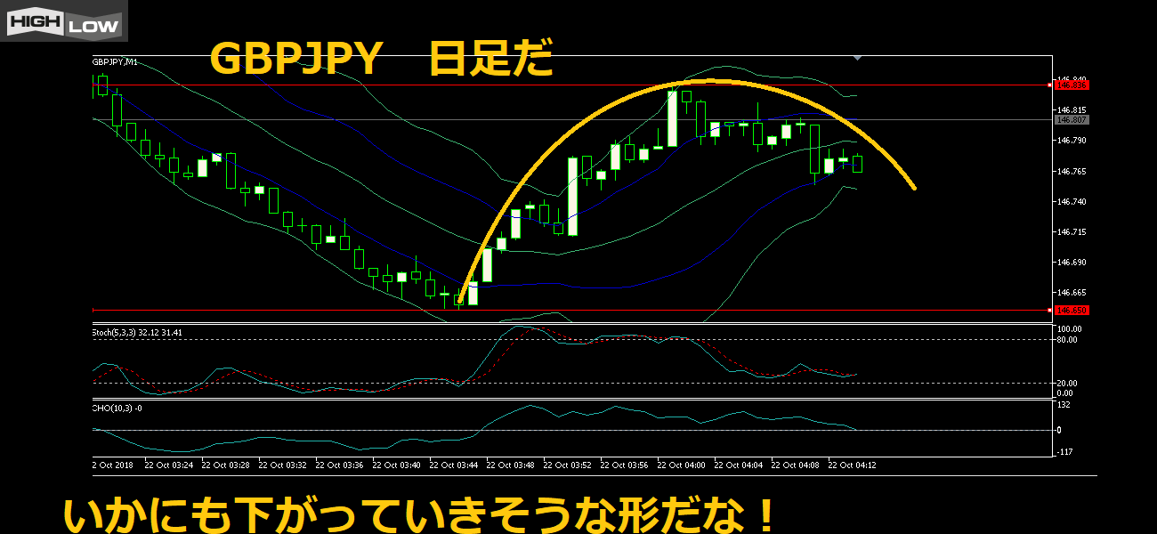 ストキャスティクスも下に向き始めていたからまた「下」だ。