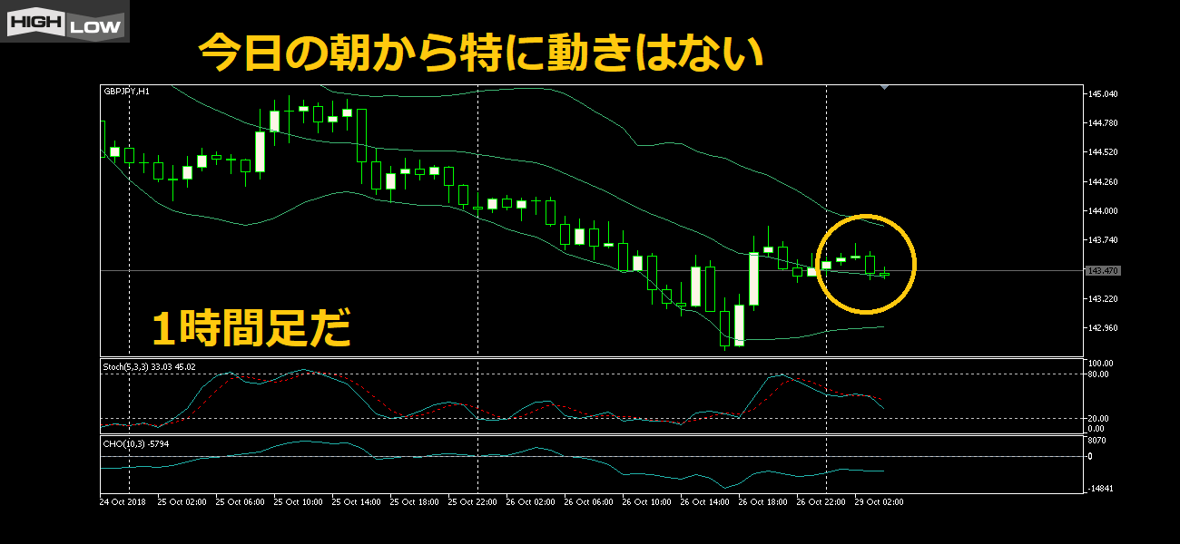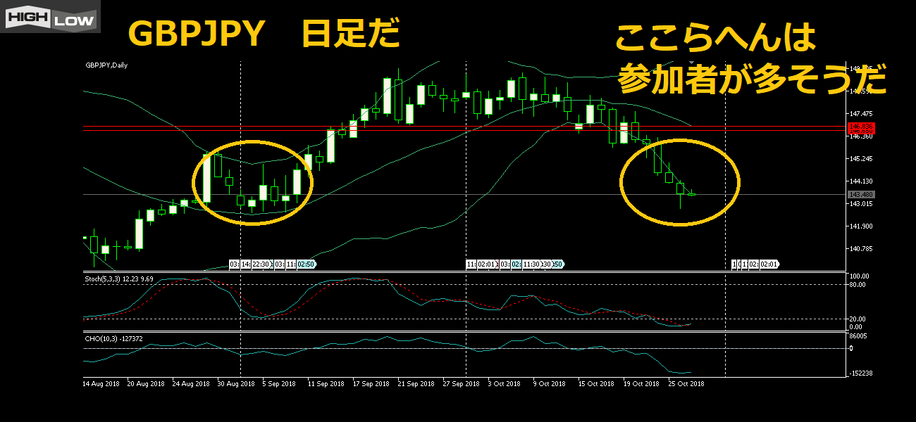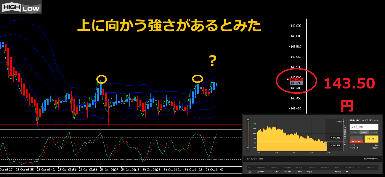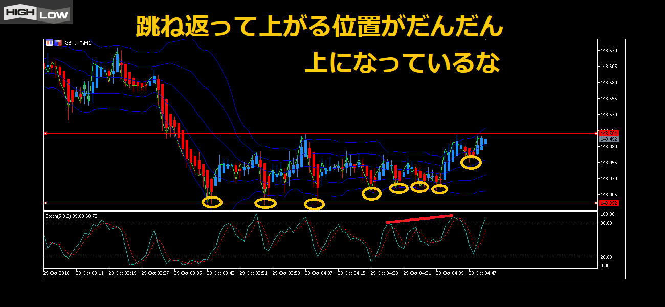 さっきの平均足とストキャスティクスの動きから「ラインの上にいく可能性が高い」と決めて、