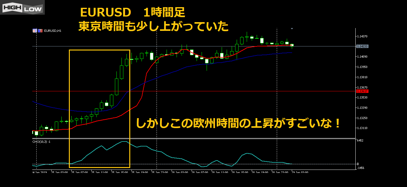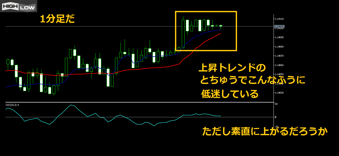 そして下のチャイキンオシレーターも0ラインより上だから上昇トレンド気味だと判断する。
