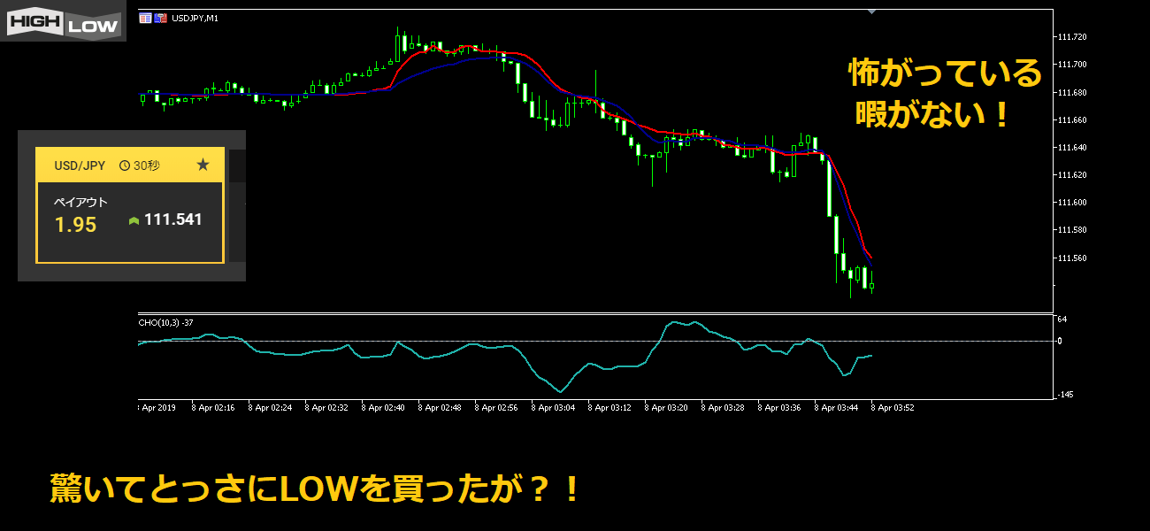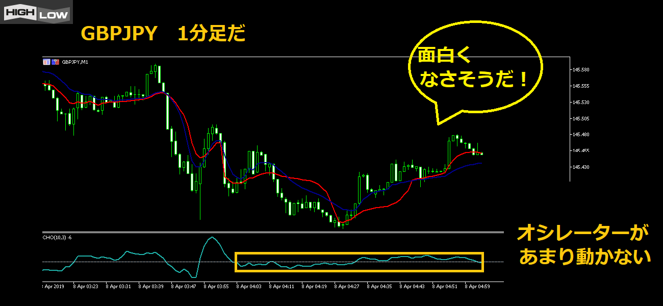 しかし、1分足ではオシレータのCHOも下に向かったままで、上昇サインがどこにもない。