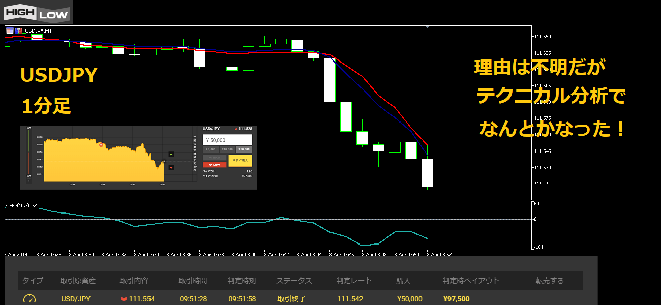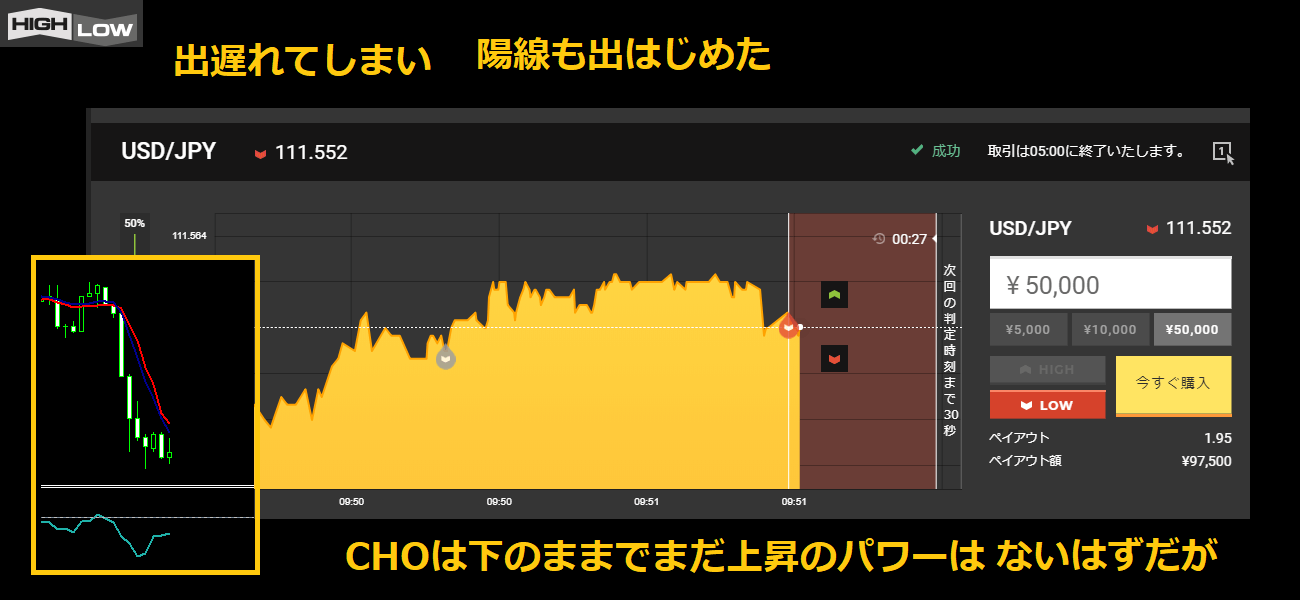 判定時間にはしっかり大陰線が出て勝てた。