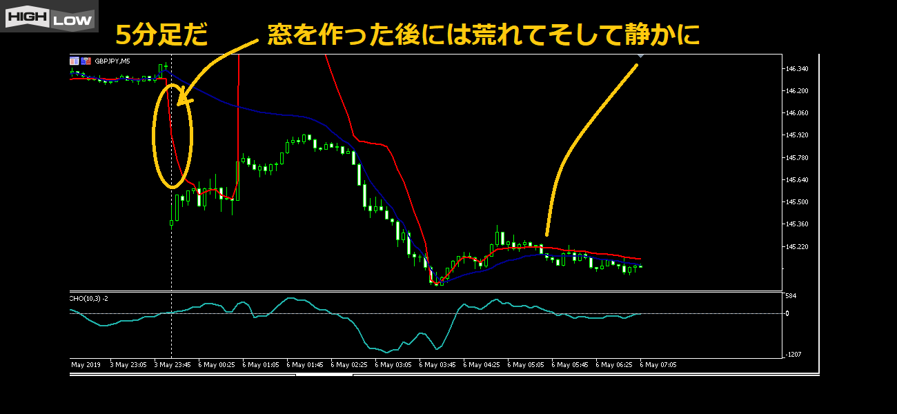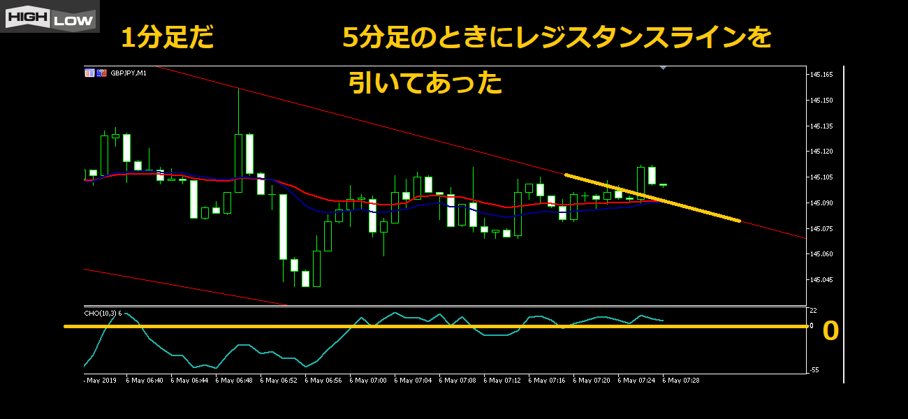 5分足のときに下降トレンドだったから、トレンドラインを引いてあったんだ。