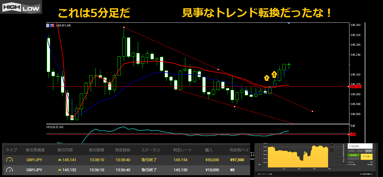 最後に、一番長い陽線がスタートしたところで30秒のHIGHを買った。
