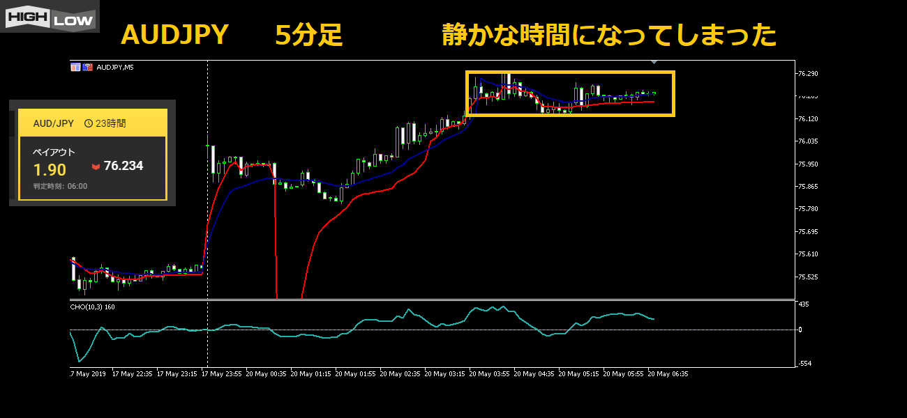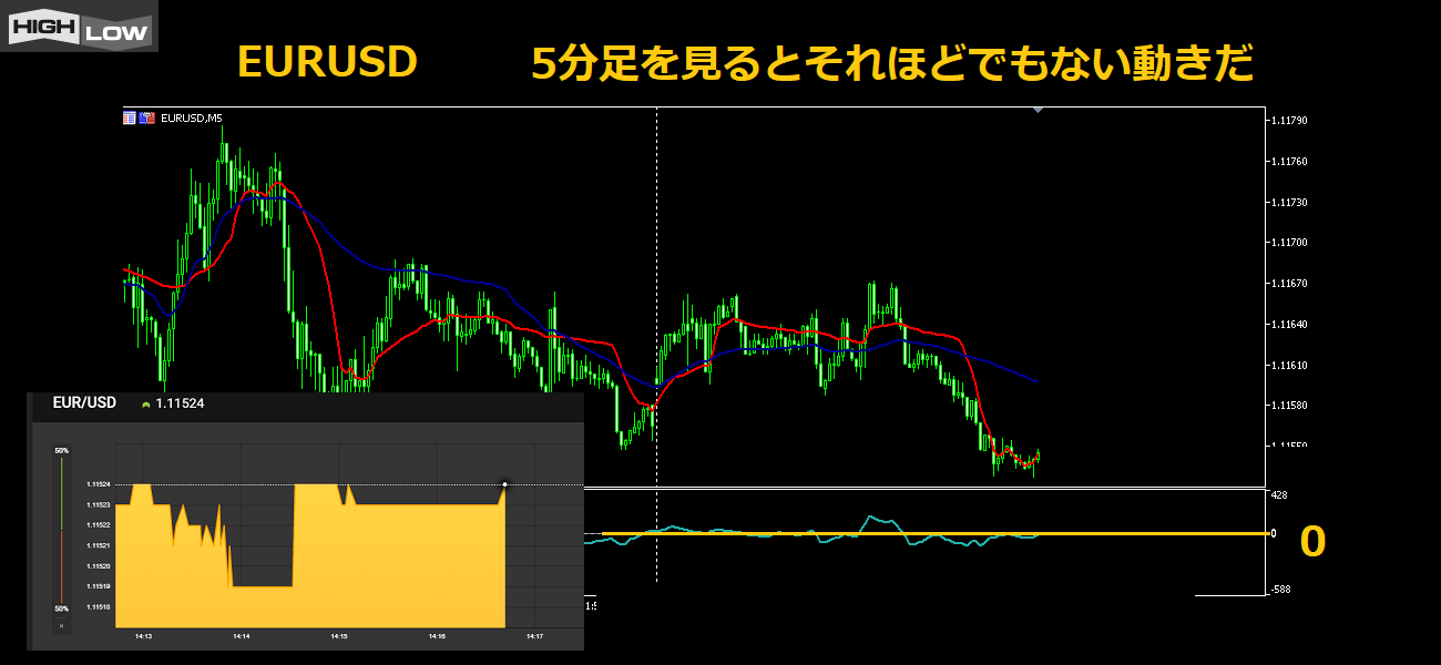 しかし5分足では、オシレータであるCHOも0ラインのまわりにからみついている。