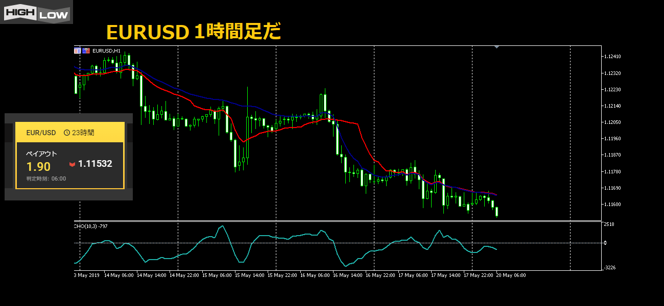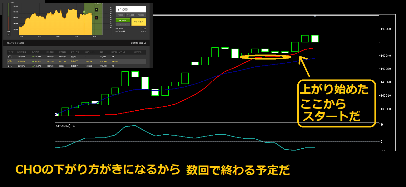 移動平均線に近づいては上がるたびに、ハイローオーストラリアのチャートも見てHIGHを買ったんだ。