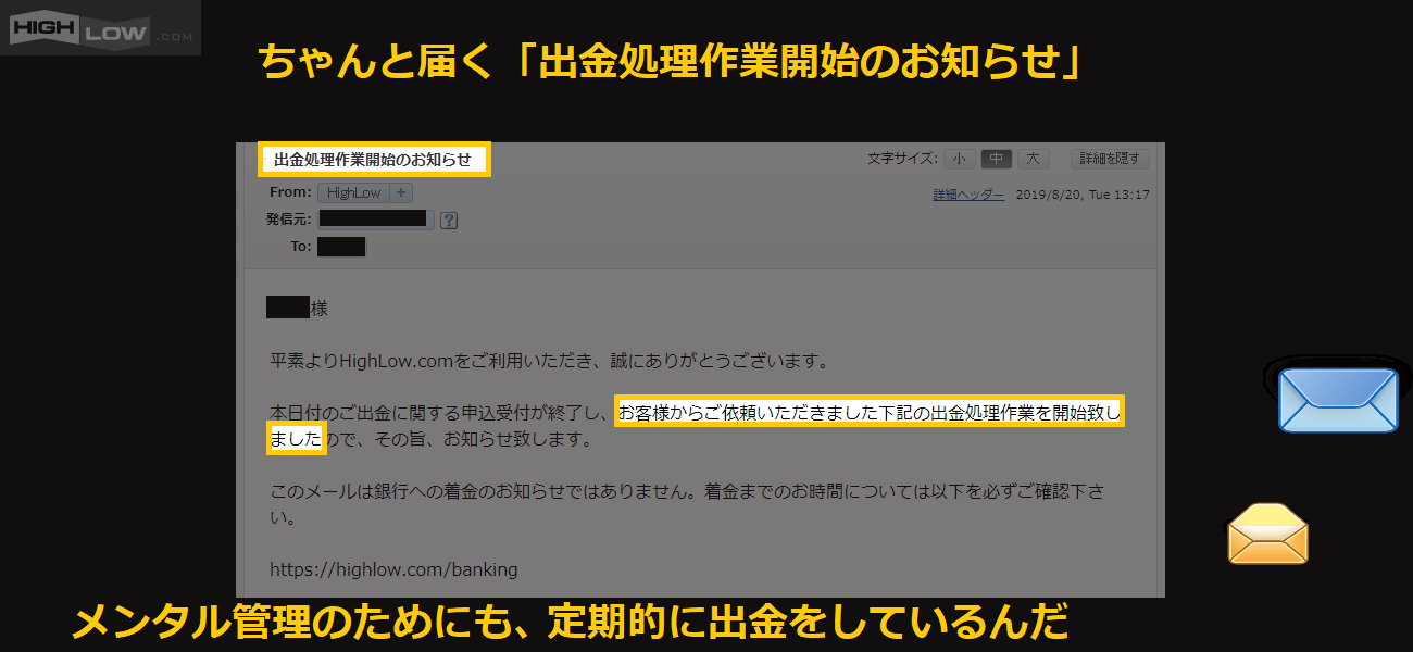出金手続きをするとちゃんと経過を知らせるメールをくれるから安心だ。