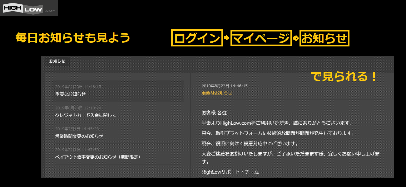 ハイローオーストラリアでは、お知らせのところにメンテナンスについて書かれていた。