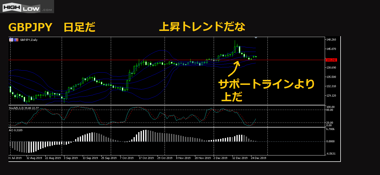 水平にサポートラインを引いたが、それよりも上にチャートがあるな。
