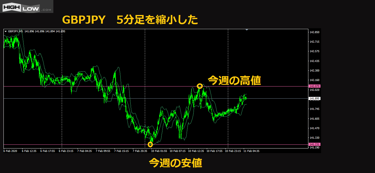 今週だけに注目して高値と安値に水平ライン(ホリゾンタルライン)を引いた。