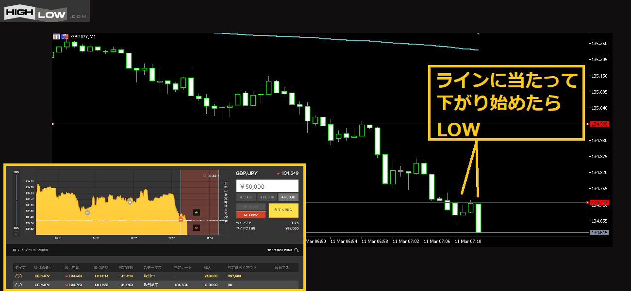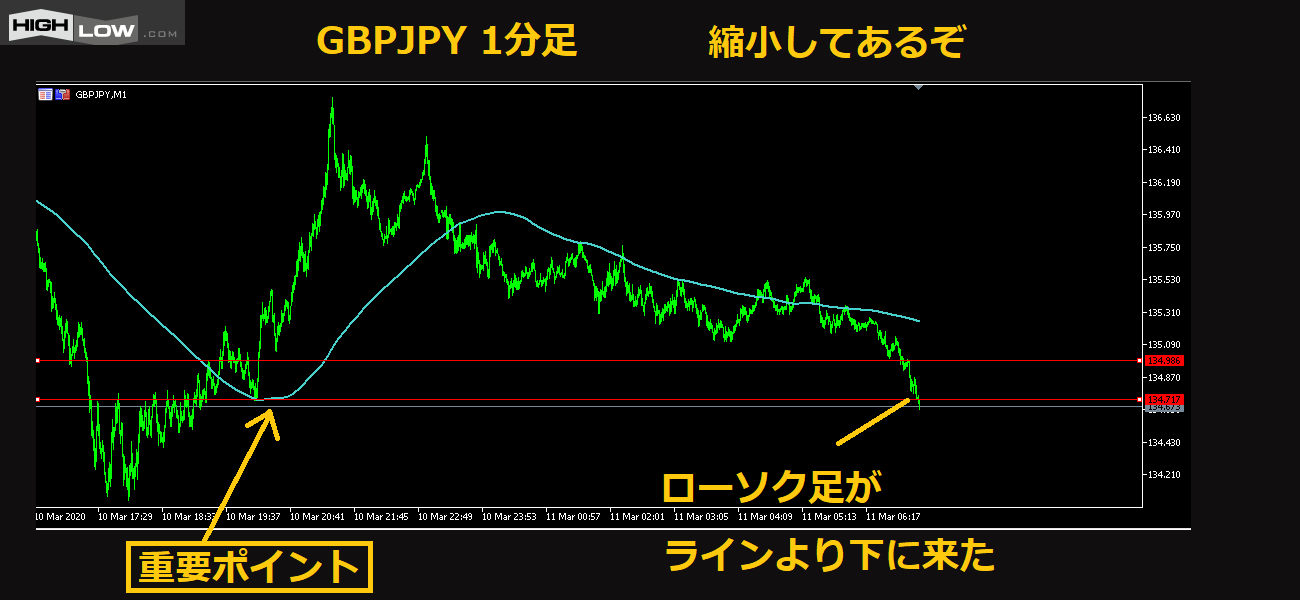 1分足は移動平均線の下にあり、下がり続けているので、こういうときはLOWだけ買う。