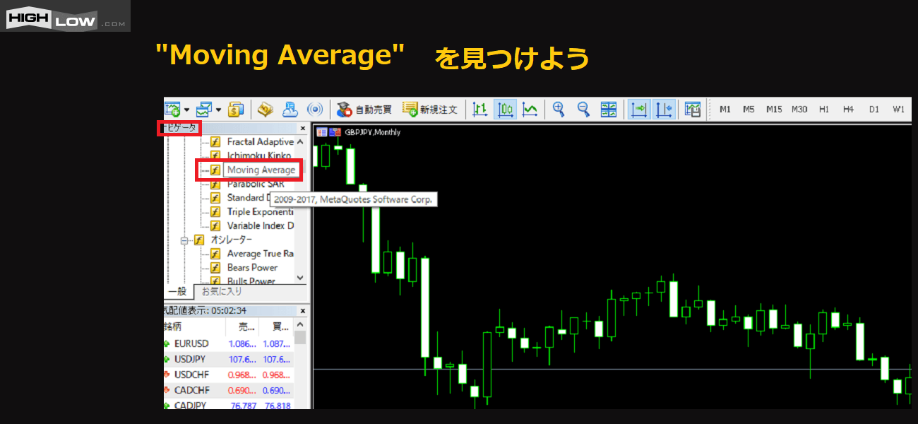 下の図のように「ナビゲータ」から「Moving Average」をいうのを探して