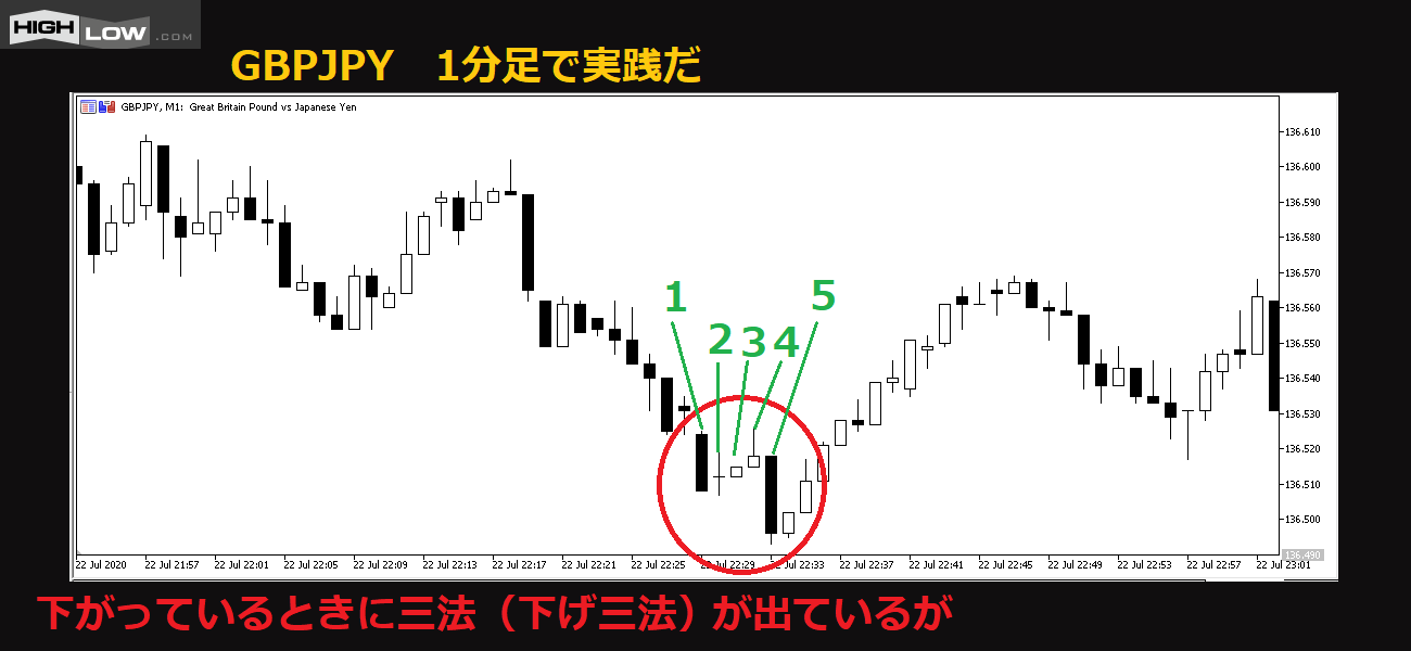 こういうときは、1分足などの短い足では「三法」の完璧な形を待つよりも