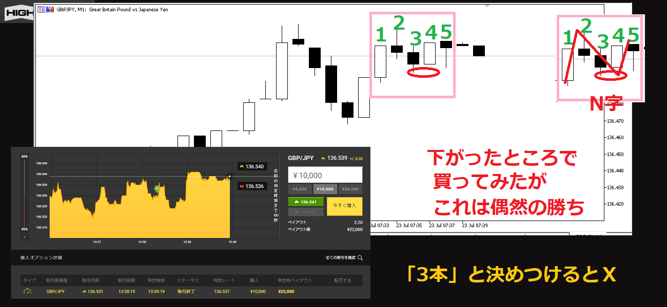 チャートがN字を描いたらタイミングよくHIGHを買えばいいんだ。