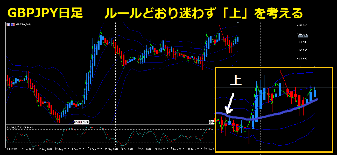 日足では、ボリンジャーバンドの真ん中の線よりもローソク足が上だ。