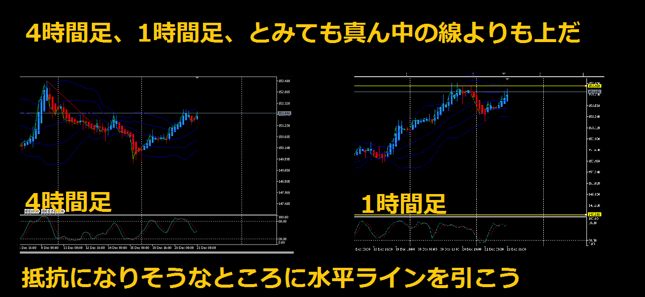 4時間足でも1時間足でも、真ん中の線よりも上にローソク足があるぞ!
